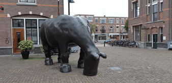 De winkels aan het plein zijn gericht op mensen met een beperkte portemonnee: een supermarkt, een vestiging van de Action en een vestiging van een multiculti supermarktketen: Tangermarkt (deze keten telt 16 vestigingen in Nederland en België). Verder zijn er een drogist van een goedkope keten en nog een tapijtenzaak. De mensen die langs lopen zijn voor een flink deel Utrechters met een, zoals dat nu heet, migratieachtergrond. Ze hebben, het is op deze doordeweekse herfstdag niet druk, soms een tas of rollator bij zich en lopen in een rechte lijn van de ene naar de andere kant. Op zeker moment zie ik drie oudere vrouwen zich ieder vooruit werken met hun rollator; hun voortgang wordt belemmerd door een aangelijnd hondje.