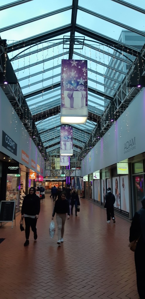De supermarkten hebben hun klandizie. Er is hier een Hoogvliet, een Lidl en een grote Albert Heijn. Verder zijn er banken, telefoonwinkels, een Blokker, een HEMA, een kantoorboekhandel, drogisterijen, schoenenwinkels en allerlei kledingwinkels van de bekende ketens, ook Marokkaanse, bloemen- en viswinkels, een Chinese Toko, een vestiging van de ANWB, dierenbenodigdheden, Turkse, Marokkaanse en Nederlandse bakkers, chocolaterie, hobbywinkels en fastfood, ook halal-varianten. En nog veel meer. En dan is er nog een speelgoedwinkel met allerlei felgekleurd zelf bewegend speelgoed. De winkels zijn voor een goed deel gericht op publiek dat op de centen moet letten, geen chique etalages maar de meer goedkopere, waaronder Zeeman, C&A en bijv. Van Haren. De gewoonheid wordt ook benadrukt door een zorgoutlet waar gebruikte gemakstoelen, rollators en elektrische rolstoelen de aandacht trekken. Een oudere man is er behulpzaam voor zijn klanten. Naarmate de tweede helft van de middag vordert, wordt het drukker. De verlichte etalages nodigen uit binnen te komen en wat nieuwe kleren te kopen.  Reclameborden en -verlichting trekken aandacht voor cadeaus, mooie winterkleren en stevige winterschoenen.