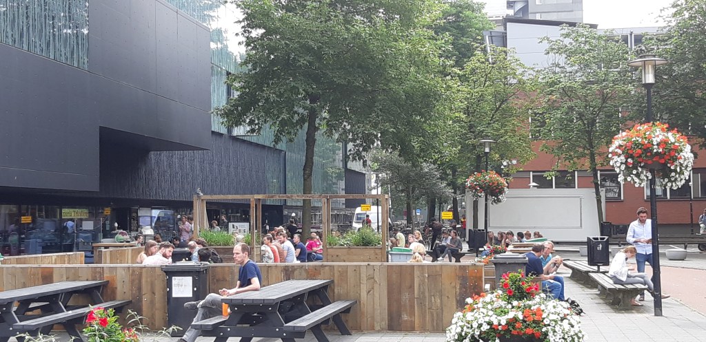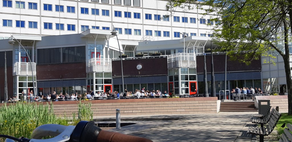 Op het Coïmbrapad, langs de Heidelberglaan, is het vandaag een levendige verzameling van groepjes studenten. Het plein telt enkele eenvoudige horecazaakjes, waar studenten koffie, broodjes, pizza’s en frites nuttigen. Ook zijn er enkele winkeltjes, waaronder, niet toevallig een grote boekhandel. Er heerst een gezellige drukte die doet denken aan een plein in het centrum van de stad. Hier zijn geen kinderen, ouders met kinderwagens of oudere patiënten. Druk overleg en gesprekjes met een enkele uitroep of vette lach zijn hoorbaar. Dit geroezemoes wordt geregeld op de achtergrond onderbroken door een voorbijgaande bus of proefrit-rijdende tram die steeds aangekondigd worden door een waarschuwend geklingel. Studenten praten over hun familie, over een feest de komende zaterdag en spreken soms, zo hoor ik over het zojuist afgelopen college. Er hangt de geurmengeling die doet denken aan een plein in Gent in de zomer, van frituur, warme broodjes en koffie. Alleen de geur van verschaald bier en muziek uit cafés ontbreekt in dit mengsel. Hoewel een voormalig volkskrantcolumnist vandaag zou bestempelen als rokjesdag, zijn er geen rokjes te zien maar lopen de jonge vrouwen vrijwel allemaal in lange broek met jasje of trui. Tussen de houten banken door loopt en fietst ieder zijns weegs.