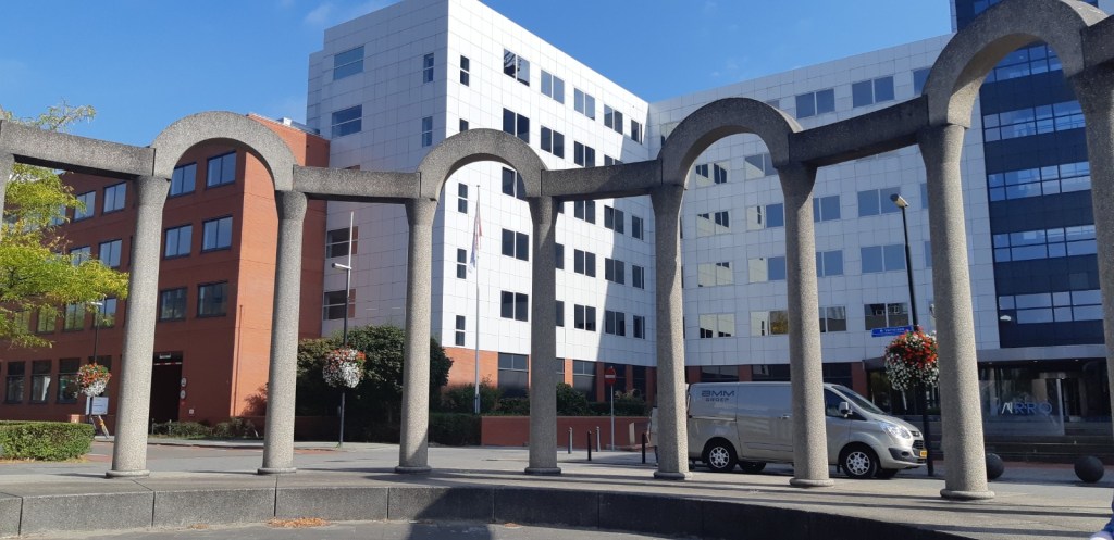 Een enkel groepje kantoormedewerkers loopt hier haar pauze wandeling, druk overleggend over allerlei waarschijnlijk belangrijke zaken of over de komende vakantie. Naast de af en toe passerende auto’s en het aanhoudende gedruis van de A28 die hier vlakbij loopt, hoor je alleen vogels, een groepje grote schreeuwende meeuwen doet denken aan Scheveningen. Verder hebben merels, meerkoetjes en een enkele eend hier vrij spel. Nota’s, contracten en adviezen opstellen gebeurt binnen, hierbuiten is het rustig en ietwat loom, het is een mooie zomerse dag.