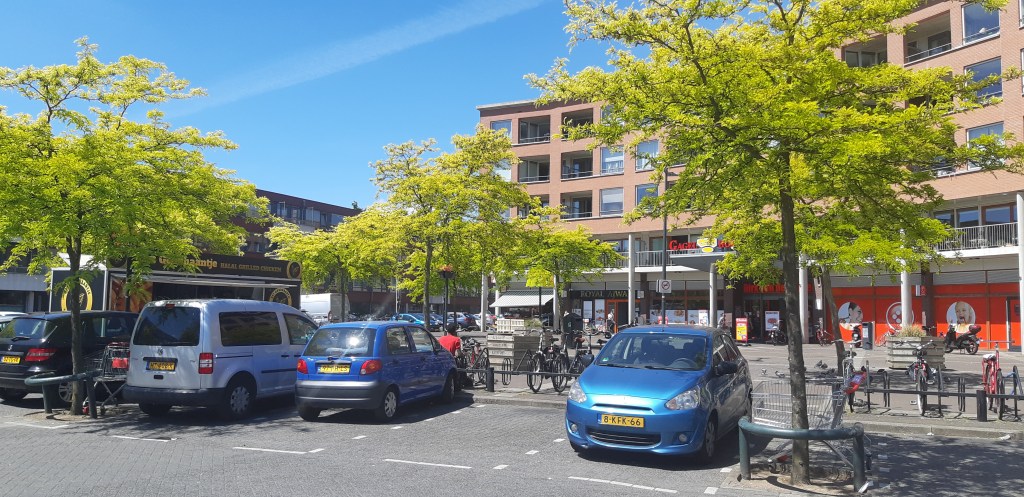 Op het plein staan een tiental boompjes met fijn getande lichtgroene blaadjes die het frisse lente-uiterlijk nog niet kwijt zijn. De boompjes geven het plein kleur gaat het plein de komende jaren steeds meer overschaduwen, zo is mijn verwachting. Tussen de bomen staan twee straatlantaarns die met een geel-glazige kap zijn uitgerust, een Ikea-schemerlamp in het groot.