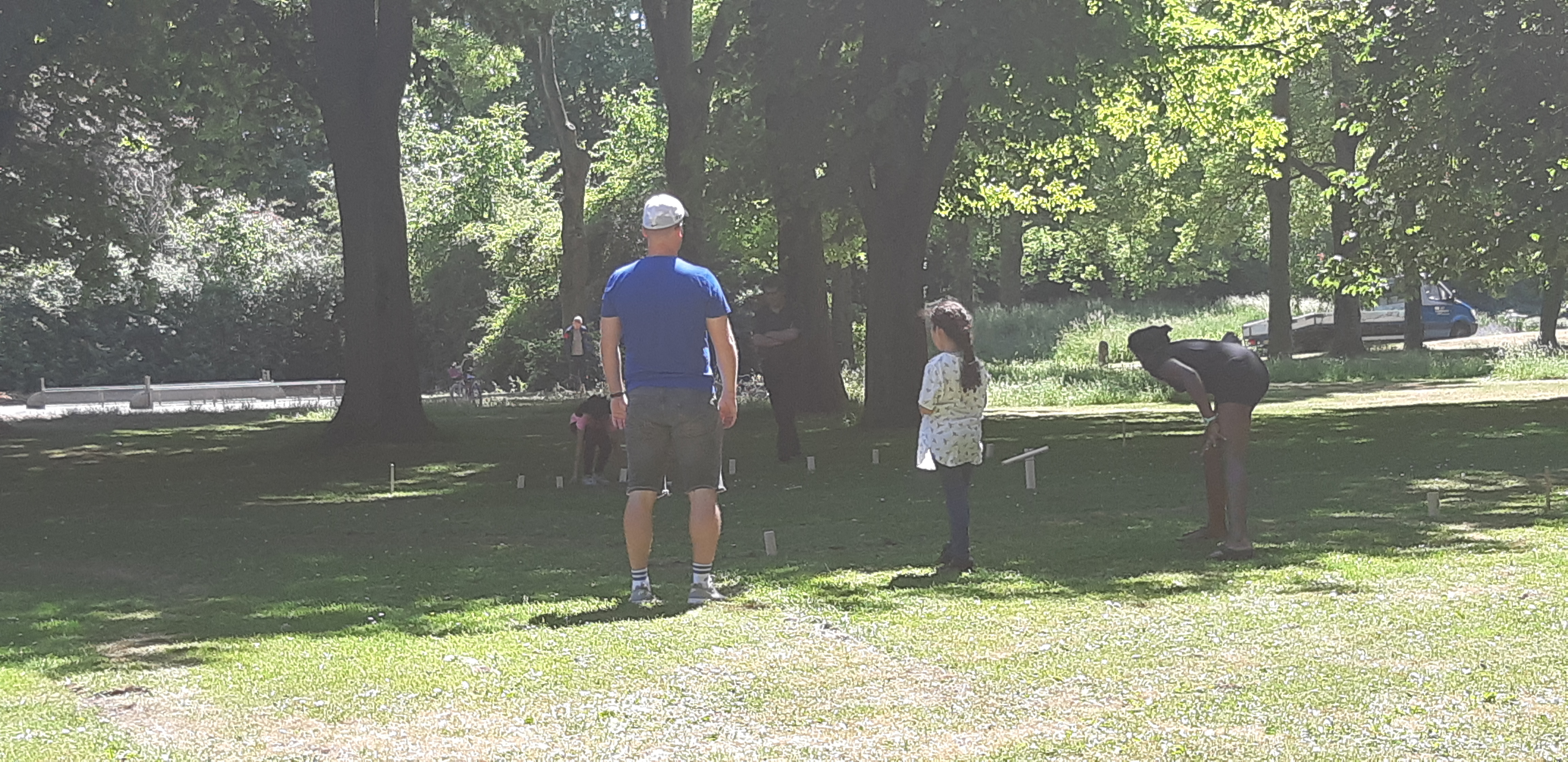 In het aangrenzende Gagelpark is het stil er is weinig volk dat een wandeling neemt, aan het sporten is of luiert in de zon. Het park wordt slechts door een enkele voorbijganger doorkruist. Bij een sportveldje is twee volwassenen met enkele kinderen een spel een spel met houten stokblokjes aan het spelen. Met de blokjes gooit men naar blokjes van de tegenstanders die enkele meters verderop staan.