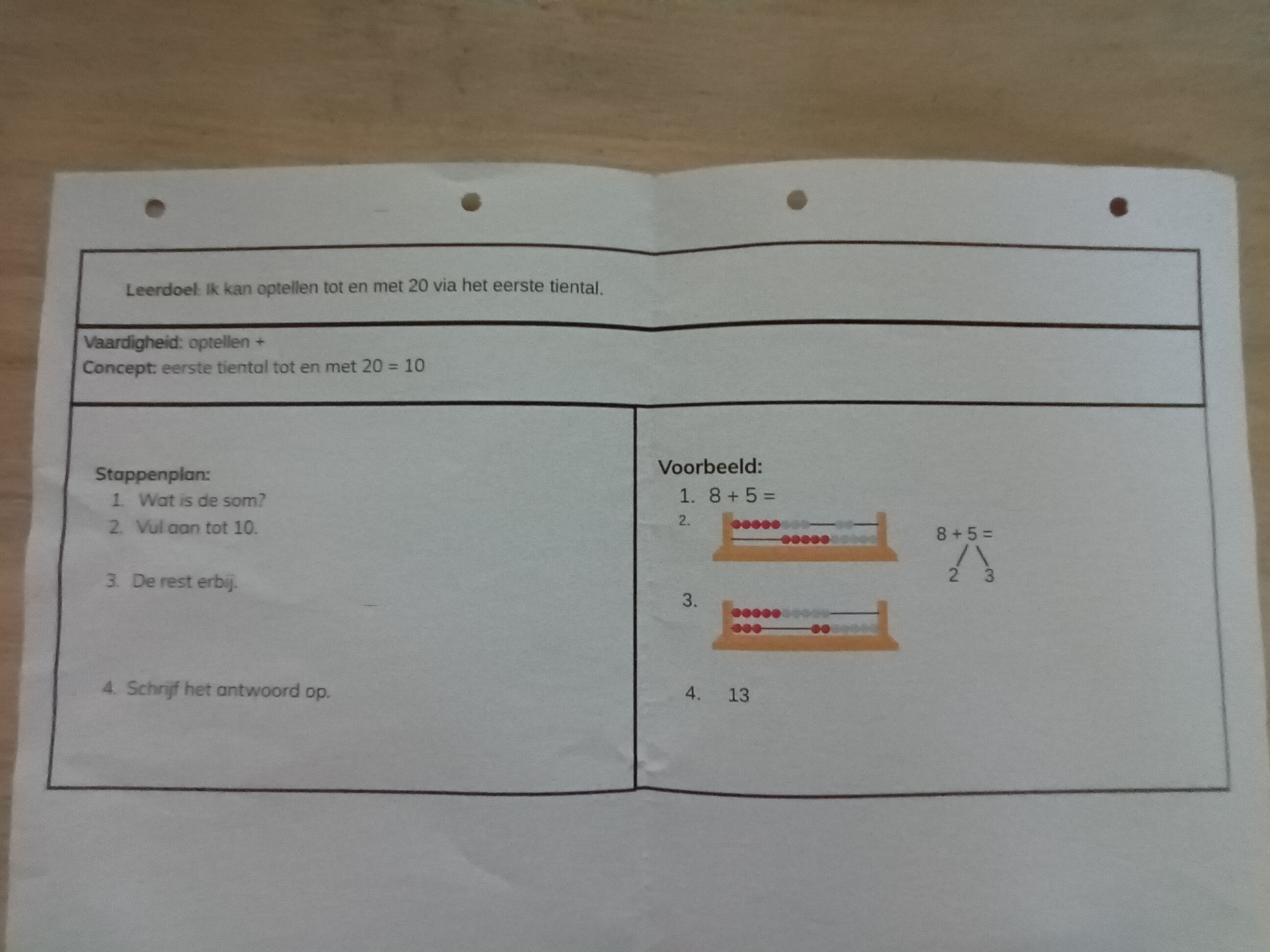 Belangrijk is dat de kinderen de som zien (en benoemen en het eerste getal van de som eerst aanvullen tot het ronde getal 10. Daarvoor moeten ze het tweede getal splitsen. Juf Eva gaat met een aantal kinderen in een ander lokaal de bijbehorende opgaven gezamenlijk maken en ik doe dit ook op de gang met drie kinderen. Van plaatjes van damstenen – of zijn het cupcakes? – moet de som afgeleid worden met behulp van het rekenrek. Het splitsen van het tweede getal leert de kinderen dat 8 + 5 anders aangepakt wordt dan 5 + 8. Bij de eerste splits je 5 in 2 en 3. Zo ontstaat de som 8 + 2 = 10 + 3 = 13. Bij de omgekeerde som splits je 8 in 5 en 3 en ontstaat de som 5 + 5 = 10 +3 =13. Ogenschijnlijk eenvoudig maar bepaald niet voor alle kinderen is dit simpel. En zo wordt er geoefend steeds met toepassing van het stappenplan. Na een poosje heb ik niet het idee dat ze het alle drie nu beheersen, ze hebben geoefend.