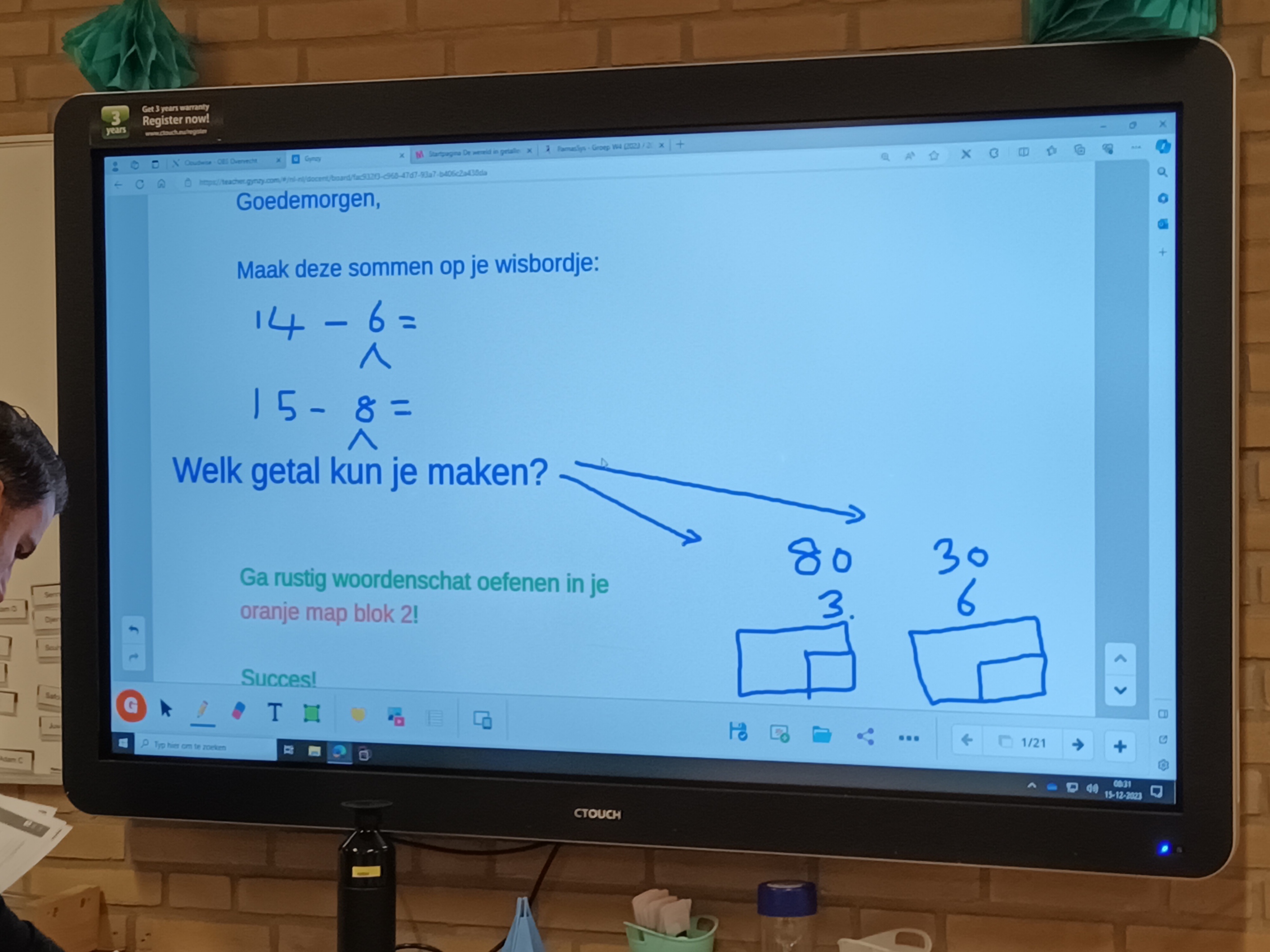 Meester Klaas van groep 5 is niet helemaal fit en na de pauze verhuis ik daarom naar zijn groep. Groep 4 is bij de inloop met hun woordenschat en met enkele plus-en minsommen bezig. De kerstboom staat er met lichtjes en al.