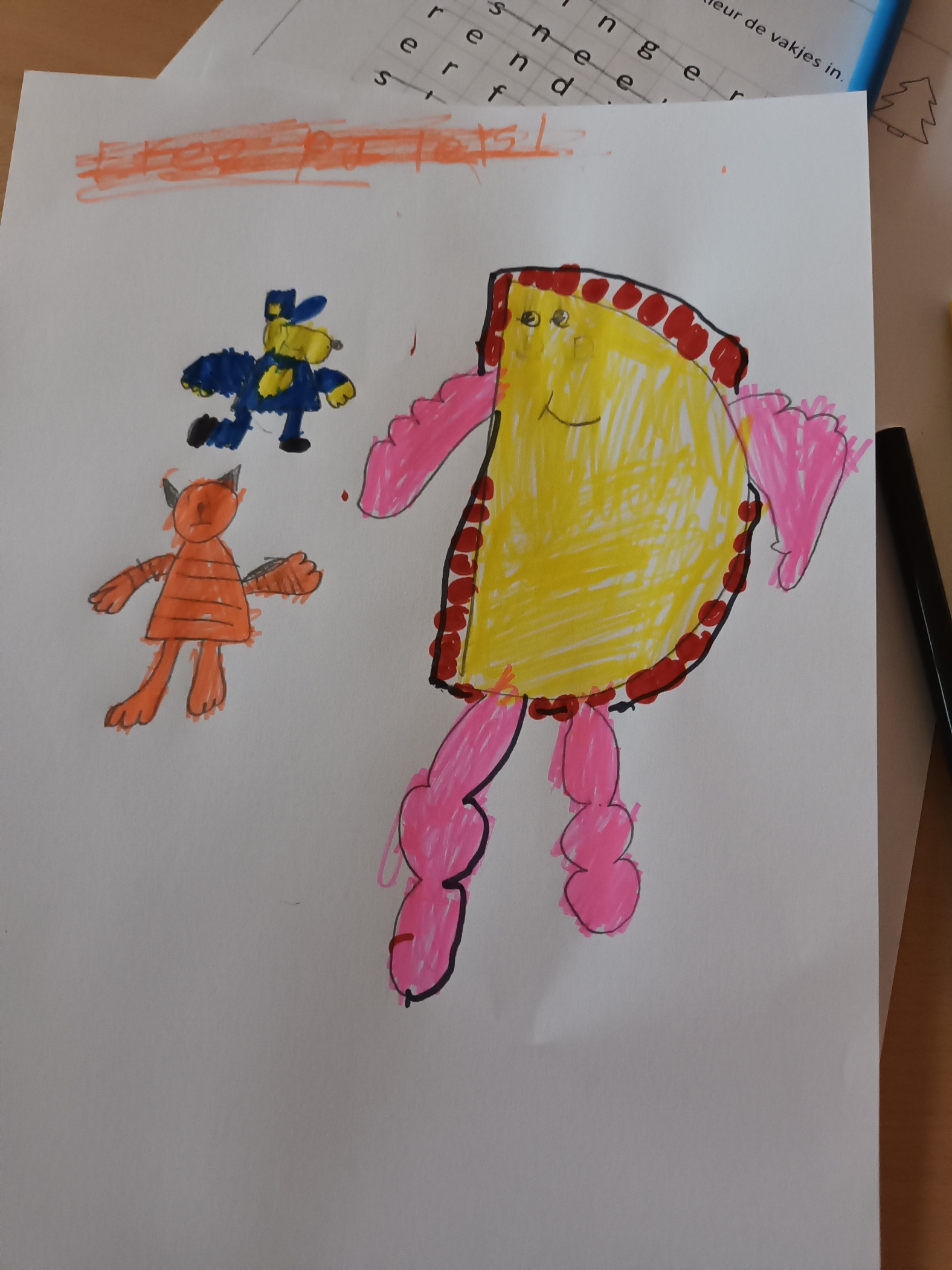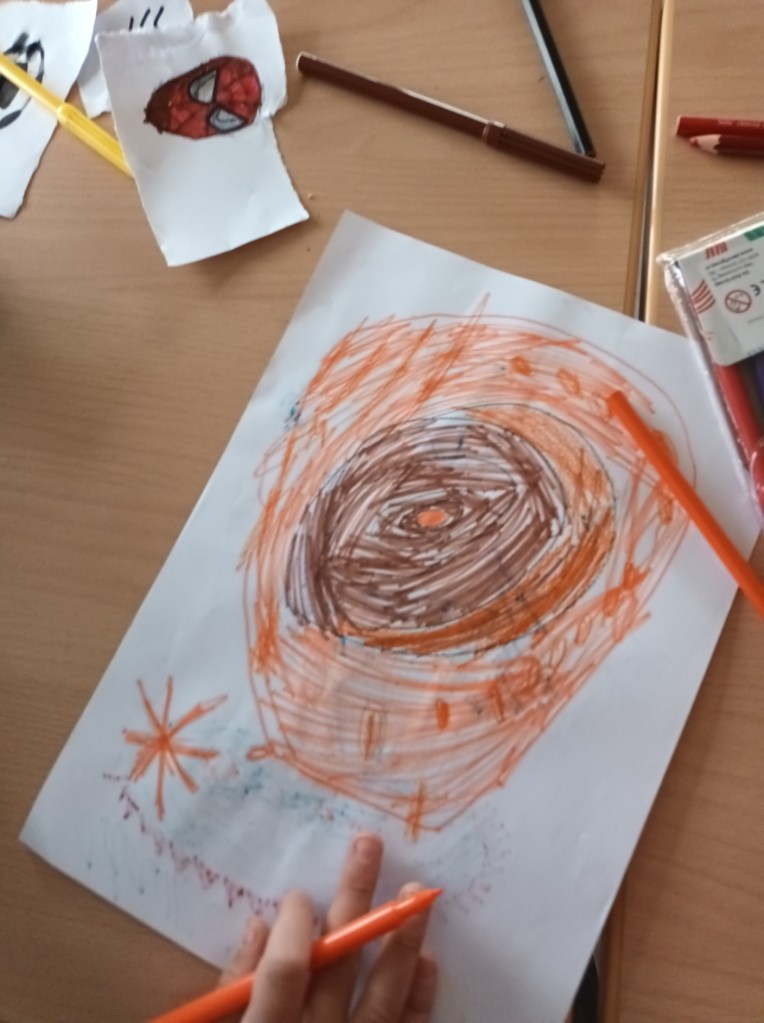 Na de woordzoeker gaan kinderen tekenen en kleuren. Voor mij is dit leuk om mee te maken omdat de creatieve vakken normaal niet op vrijdagmorgen op het rooster staan. Ik merk dat er veel tekentalenten in de klas zitten, die overigens op heel verschillende manieren uitpakken. Ik deel veel complimenten uit.