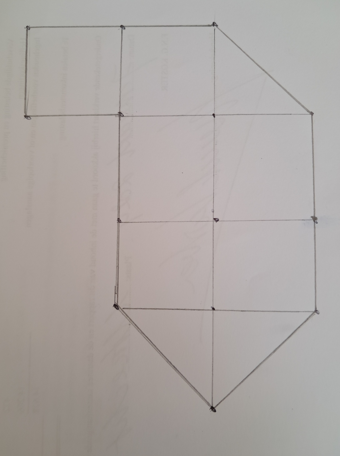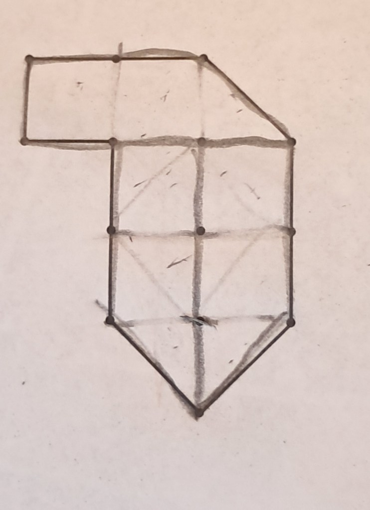 Zij weet niet hoe je dit moet aanpakken. Ik geef haar de suggestie de (hulp)puntjes met lijnen te verbinden en vroeg toen hoeveel vierkanten en hoeveel driehoeken het gehele figuur telde. “Zes vierkanten en drie driehoeken.”