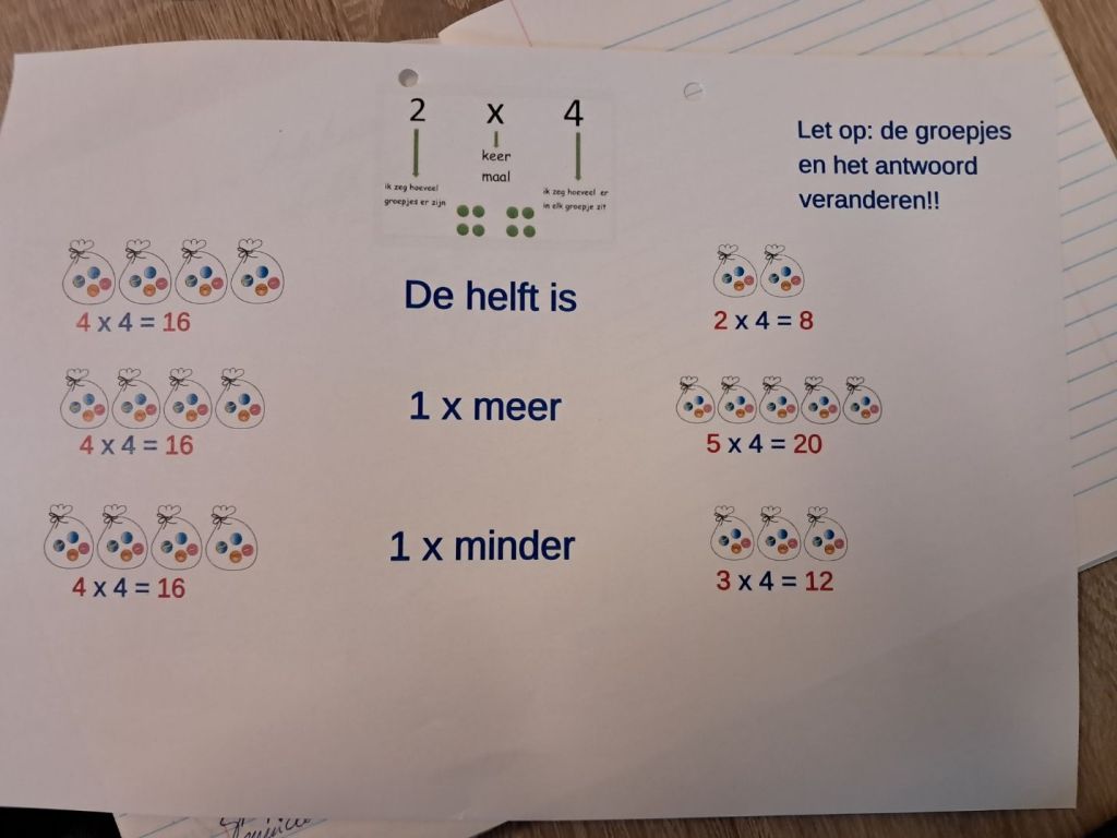 Rekenen staat dan op het programma: keersommen aanpassen, één keer meer en één keer minder, d.w.z. een groepje meer of een groepje minder. Ook het halveren van een keersom komt aan bod. Meester Sjoerd heeft eerder in de week het stappenplan dat hierbij hoort uitgedeeld.