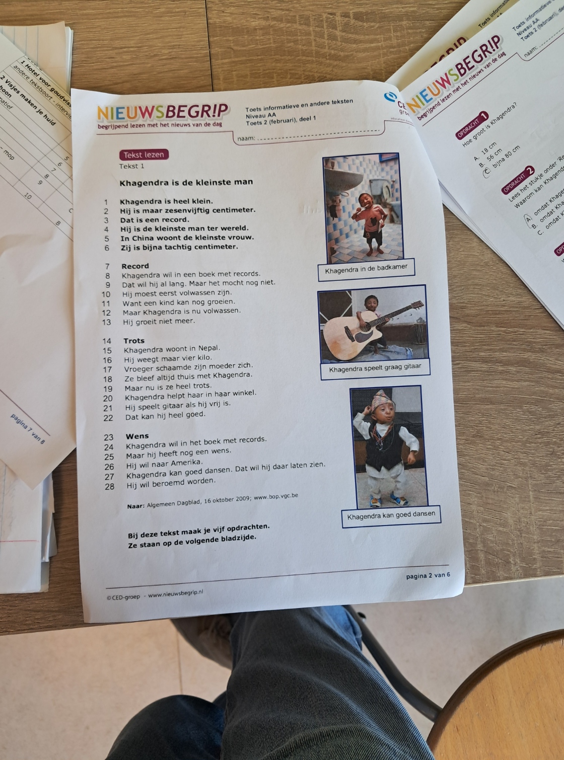Terwijl meester Sjoerd klassikaal Nieuwsbegrip doet neem ik twee kinderen een inhaaltoets begrijpend lezen af. Zij lezen drie tekstfragmenten van Nieuwsbegrip en beantwoorden enkele vragen over elk fragment. De vragen zijn meerkeuzevragen, een kruisje of rondje bij het juiste antwoord volstaat.