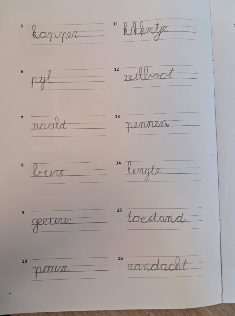 Het zijn allemaal verschillende opgaven, vaak met beeld en verhaal waar zij een som van moeten maken.Als zij klaar zijn kunnen zij aan hun weektaak verder. Op verzoek ga ik intussen een spellingopdracht nakijken. Het valt mij daarbij op dat de kinderen die verhoudingsgewijs het netste schrijven, ook de minste fouten maken. Hoewel ik verwacht dat meisjes vaker dan jongens netjes schrijven, is dat hier niet het geval twee jongens en een meisje schrijven alle drie duidelijk en regelmatig en maken de minste taalfouten. Bijgaand werk is van een jongen.