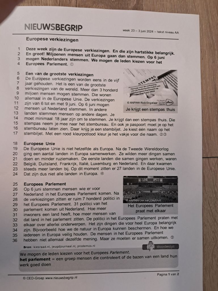 De vier kinderen beginnen vol ijver aan de tekst over de Europese verkiezingen. Bij de tweede paragraaf begint de aandacht te verslappen en mijn vermaningen komen steeds vaker terug. Uiteindelijk stuur ik twee kinderen terug naar de klas en heb ik nog een gesprek over de verkiezingen met de twee overgeblevenen.