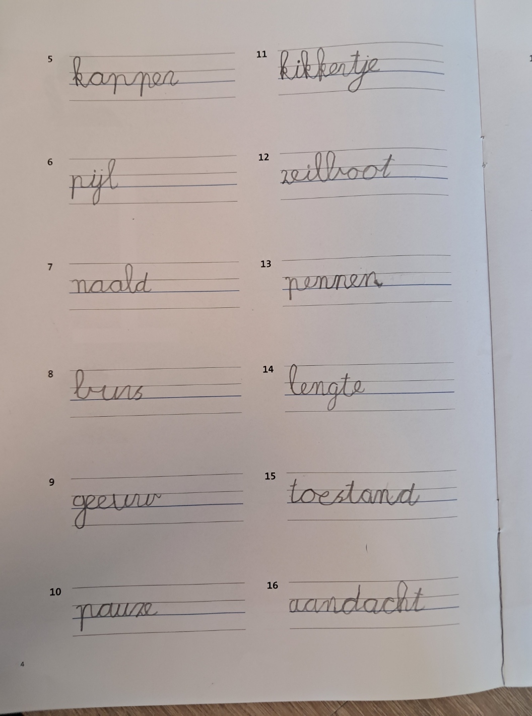 Het zijn allemaal verschillende opgaven, vaak met beeld en verhaal waar zij een som van moeten maken.Als zij klaar zijn kunnen zij aan hun weektaak verder. Op verzoek ga ik intussen een spellingopdracht nakijken. Het valt mij daarbij op dat de kinderen die verhoudingsgewijs het netste schrijven, ook de minste fouten maken. Hoewel ik verwacht dat meisjes vaker dan jongens netjes schrijven, is dat hier niet het geval twee jongens en een meisje schrijven alle drie duidelijk en regelmatig en maken de minste taalfouten. Bijgaand werk is van een jongen.