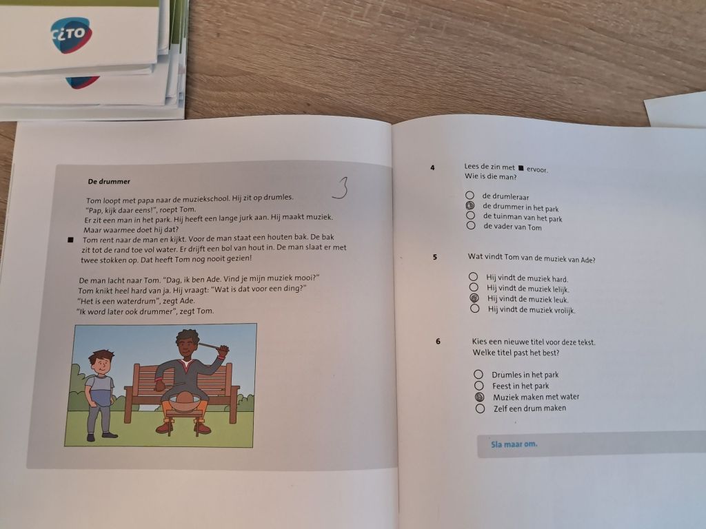 Na dit gesprek begint meester Sjoerd met een dictee. Het gaat o.a. om de woorden: reis, kwijt, spijt, feestje, foto, kieuwen, dicht, bocht, nacht, schram. Ik kijk intussen een taaltoets na, waarbij getoetst wordt of de kinderen enkele teksten goed begrijpen.