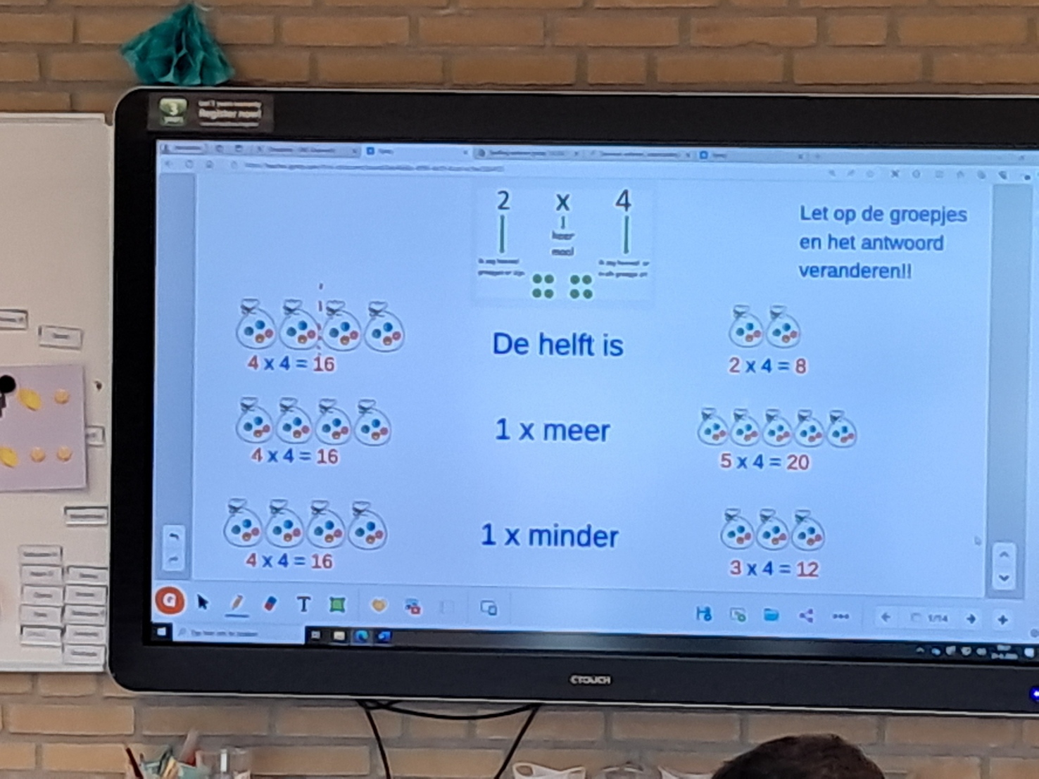 Er volgt wat klassikale uitleg over vermeerderen en verminderen bij keersommen. Deze herhaalde uitleg bleek nodig na een toets. De kinderen moeten hun wisbordjes met stift op tafel klaar leggen en de eerder aan hen uitgedeelde uitleg.