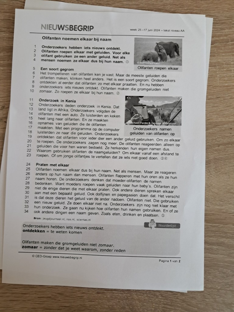 Bij het onderdeel begrijpend lezen met Nieuwsbegrip gaat het over een onderzoek naar de communicatie van olifanten. Deze blijken als zij grommen zich specifiek tot één andere olifant te richten. Bij olifanten is grommen een ander aanspreken of roepen. Omgekeerd reageert een olifant alleen bij een bepaalde manier van grommen. Ze lijken een naam te hebben, die hun moeder hun heeft gegeven.