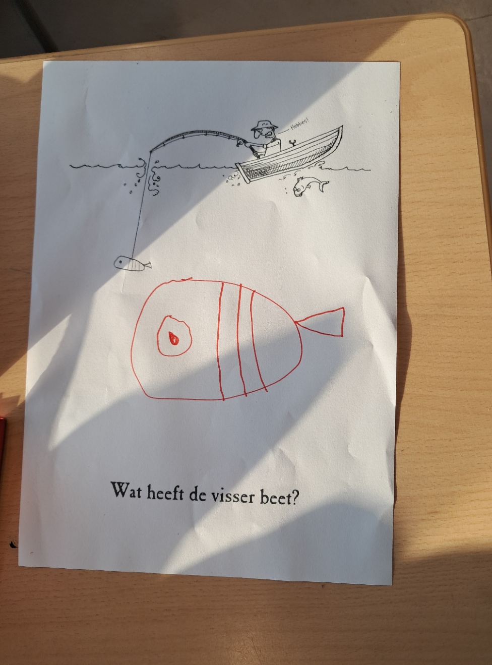 De opdracht bij binnenkomst staat op het bord: het eerste kwartier gaan de kinderen een tekening afmaken, met daarop een visser in een bootje met een hengel uit. Zij gaan tekenen wat de visser op hengelt. Meester Klaas benadrukt dat hierbij alles mag: de kinderen kunnen hun fantasie gebruiken en mogen de hele tekening met kleur en al vullen. De kinderen hebben echter veel met elkaar uit te wisselen en zijn daarin bijna niet te stoppen.
