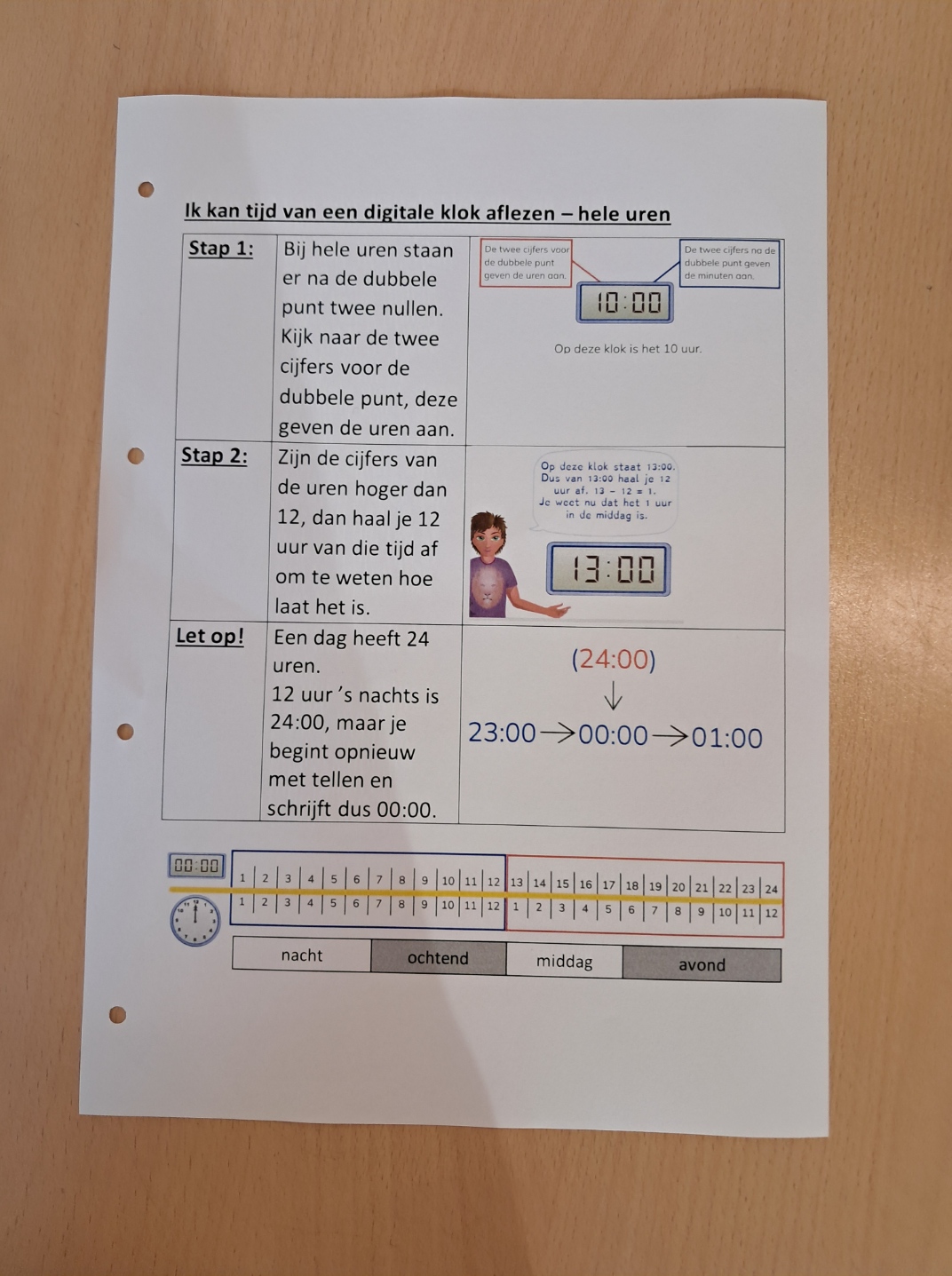Meester Klaas geeft bij wijze van herhaling vragenderwijs nog enige uitleg: Hoeveel seconden zitten in een minuut? Hoeveel minuten zitten in één uur? Een half uur is hoeveel minuten. En hoeveel minuten telt een kwartier? Een dag telt 24 uur; 24 uur wordt ook een etmaal genoemd. Tenslotte legt meester Klaas het verschil uit tussen een analoge 12 uurs-klok en een digitale 24 uurs-klok. En deelt een stappenplan annex uitleg uit.