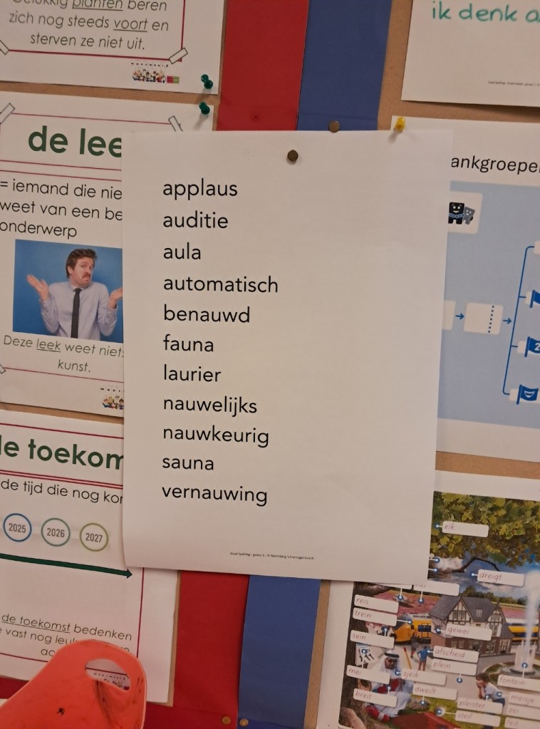 Ik geef de binnenkomende kinderen een goedemorgen-hand en ben blij ze weer te zien. Aan hun gezicht te zien is het bij de meesten ook omgekeerd. Een kind vraagt wat een kabeljauw is. Als alle woorden ingevuld zijn wacht nog een reeks woorden met au die aan de achterkant van het blad opgeschreven moeten worden. Daarna kunnen de kinderen aan de slag met overig werk dat nog ligt, voor veel kinderen is dit: vragen beantwoorden van Nieuwsbegrip.