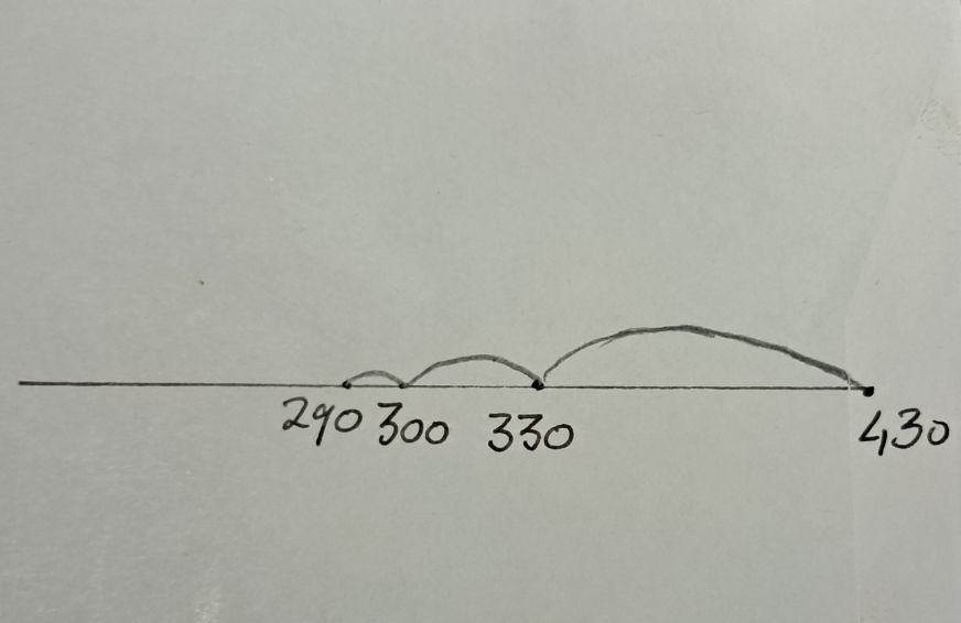 Eerst een getallenlijn: bij een minsom zet je het uitgangsgetal rechts. Je haalt er vervolgens eerst 100 vanaf. Daarna verminder je 330 tot 300. En ten slotte verminder je 300 met de laatste 10.