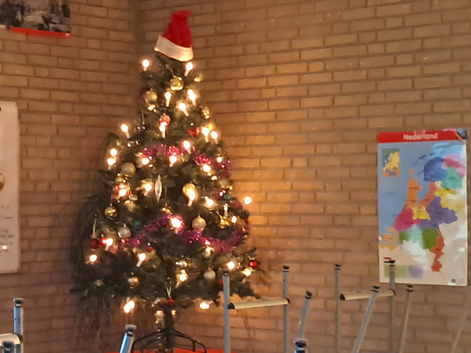 De kinderen gaan in stilte – het stoplicht op het bord staat op rood – aan de taalopdracht beginnen, het laatste onderdeel van deze morgen. Meester Klaas en ik lopen rond en worden geregeld te hulp geroepen bij vragen als; wat is het werkwoord, hoe schrijf je sauna,enz. Na 15 minuten ruimen de kinderen hun spullen op en halen hun schooltas met lunch. Tijdens de lunch gaat het grote licht weer uit, de rolgordijnen zijn neer zodat de verlichte kerstboom goed zichtbaar is. Deze decembersfeer zorgt in de groep voor uitgelatenheid en bijpassend rumoer.