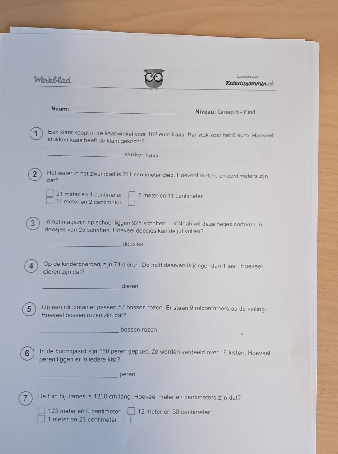 Ik maak er vandaag geen wedstrijdje van. Wij doen de sommen gezamenlijk: eerst de tekst lezen, dan de som opschrijven en vervolgens som uitrekenen. Bij de eerste som roept een kind direct het antwoord, zonder de som opgeschreven hebben. Ik leg nog eens uit dat bij een redactiesom het opstellen van rekensom uit de tekst de belangrijkste opgave is. Samenwerkend komen alle redactiesommen tot een goed einde. Het groepje heeft goed gewerkt.