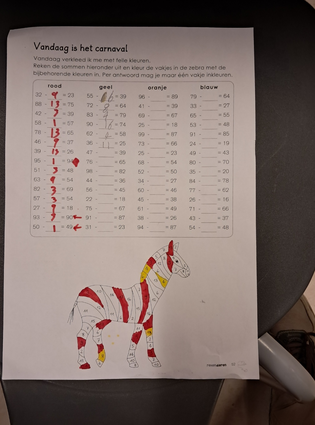 De kinderen moeten de tekst van de som lezen (slechts één zin) en in hun rekenwerkschrift de som die uit de tekst voortvloeit op schrijven. Daarna moeten zij, al dan niet met behulp van een getallenlijn de som uitrekenen.