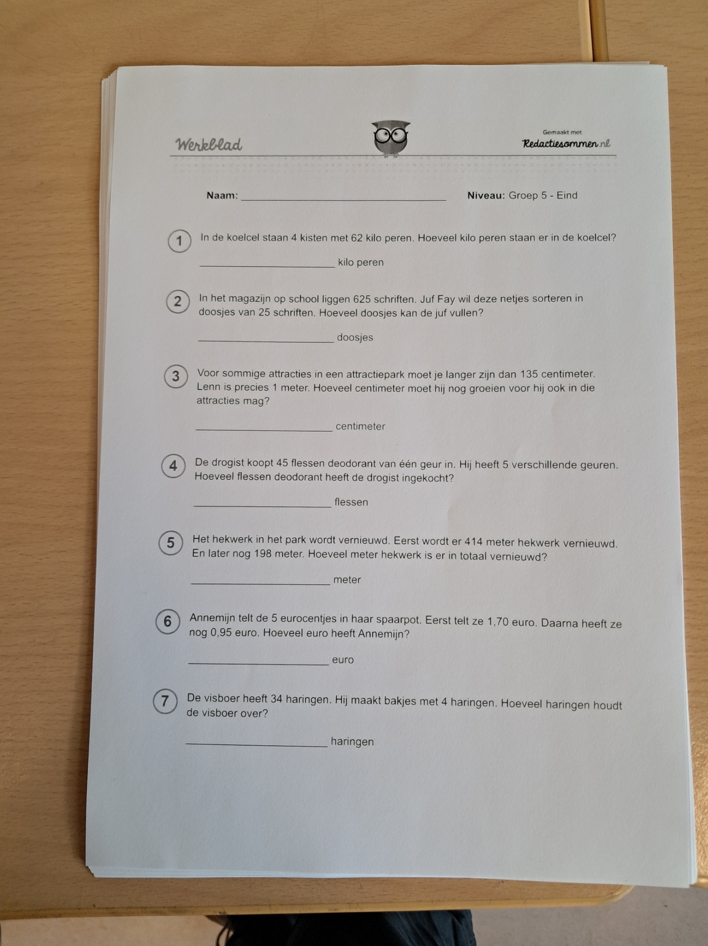 Aan het begin van de dag komt in plaats van meester Klaas, die eerst een (dringend) oudergesprek heeft, juf Anne in de klas. Zij legt als eerste uit waarom zij er even is en ik kan direct met groepen kinderen redactiesommen gaan doen. Ik pak het anders aan dan vorige week. De kinderen krijgen niet de opgaven te lezen, maar ik lees ze voor en zeg hun eerst de som op te schrijven die uit de tekst volgt. “Daarna gaan we de som oplossen.”