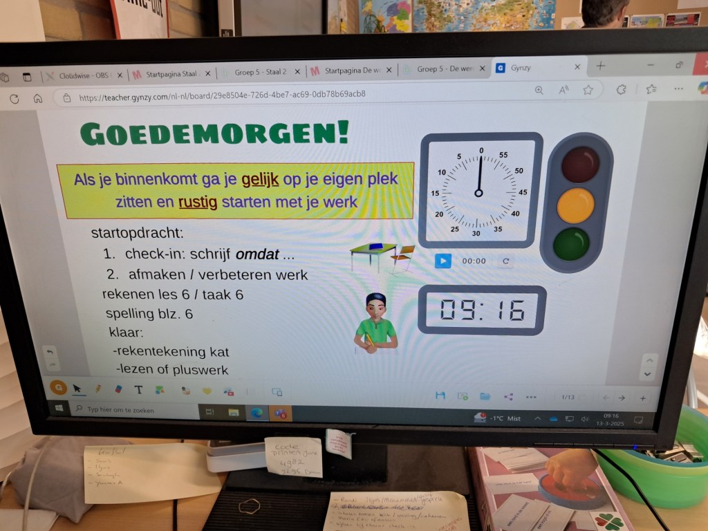De kinderen zijn intussen gewend aan de gewoonte van “inchecken”, d.w.z. met het deponeren van hun naamstokje in het betreffende bakje geven zij aan hoe ze zich voelen bij binnenkomst. Een kind geeft op deze manier aan trots te zijn. Als ik vraag waarop zegt hij dat hij trots is dat hij vandaag vast. De klas is rustig vanmorgen en gaat aan het werk met hetgeen op het bord en op het scherm van meester Klaas staat aangegeven.