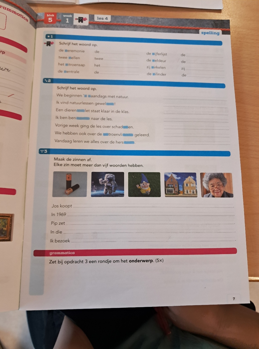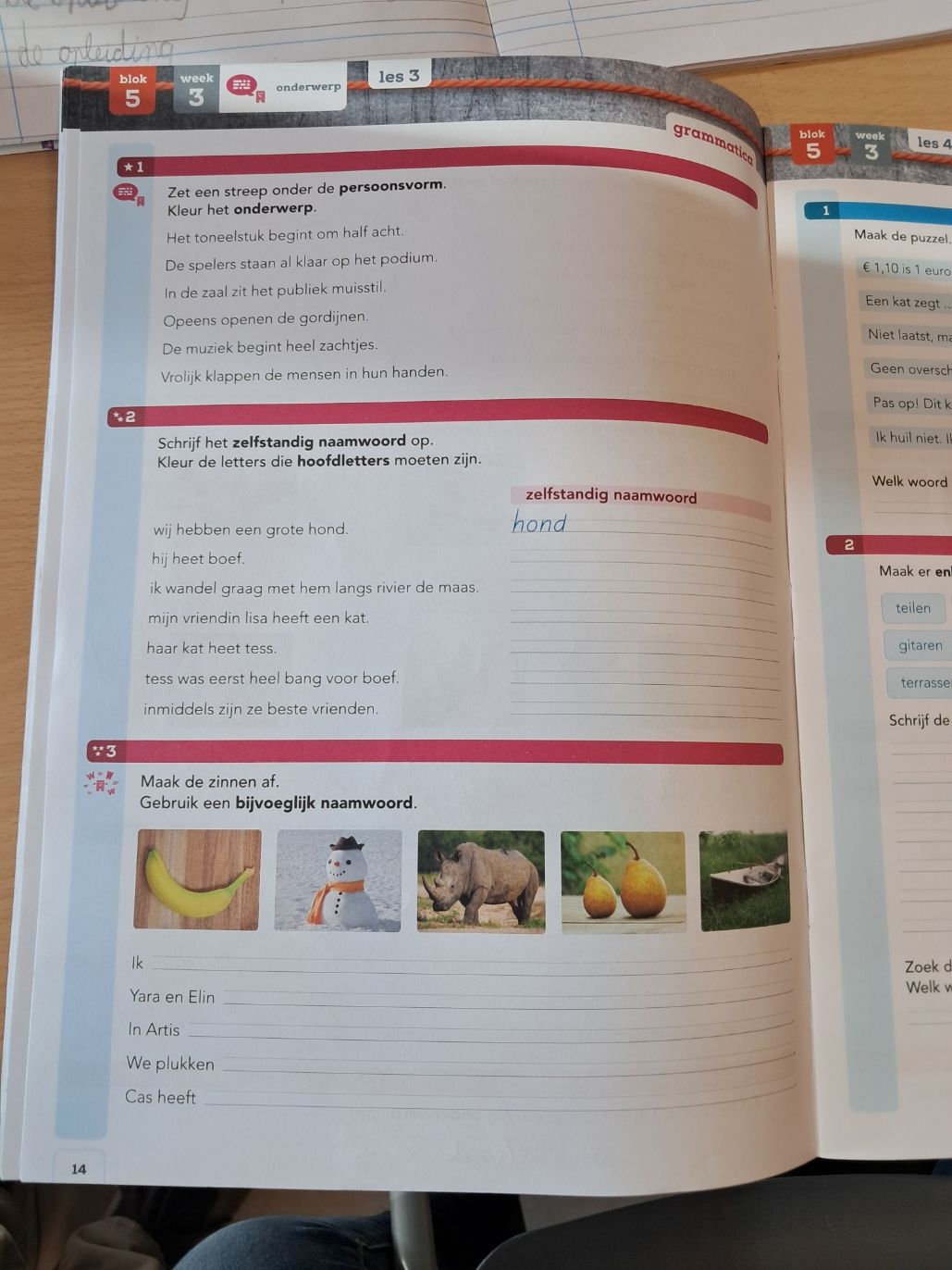 Na het dictee, ik zie dat sommige kinderen steeds regelmatiger en leesbaarder schrijven, volgde opdrachten van een bladzijde van hun taalwerkschrift. Er zijn enkele kinderen die vandaag moeite hebben met concentratie, deze worden uiteindelijk even apart gezet; de meesten gaan direct aan de slag en vragen soms hulp of uitleg.