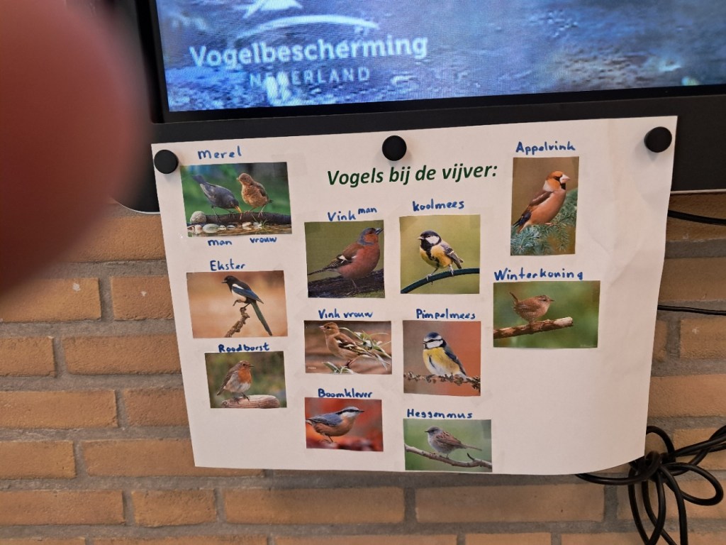 En dan is er fruit eten en ochtendpauze. Bij het fruit eten zet meester Klaas een van de vaste beelden van Beleef de Lente[1] op het digibord het is de vijver waarin van alles passeert. Onder aan het digibord hangt een papier waarop alle vogels staan die zijn tot nu gespot hebben in deze vijver.