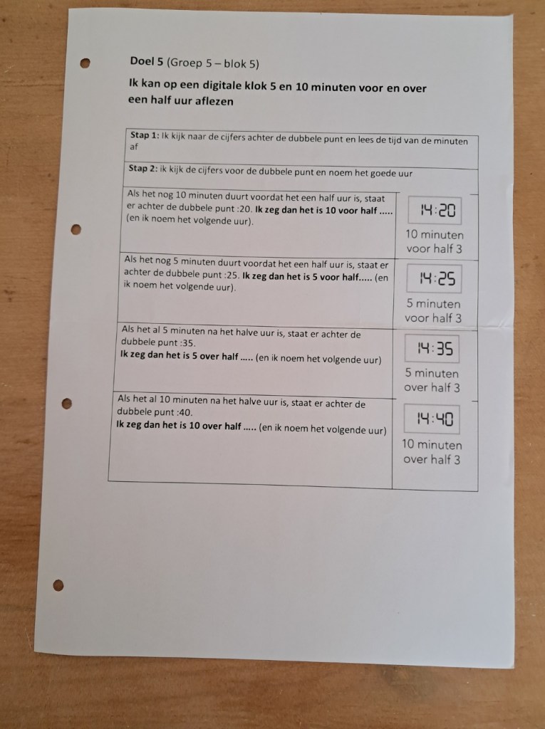 Ik ga vandaag niet met enkele groepjes rekensommen maken, maar blijf bij de uitleg over het lezen van de digitale klok. Meester Klaas zegt tegen mij dat zij dit moeilijk vinden. Eergisteren was de uitleg over het lezen van de tijden 10 voor, 5 voor, 5 over en 10 over het halve uur op een analoge klok. Vandaag gaan wij dezelfde tijden lezen van een digitale klok.