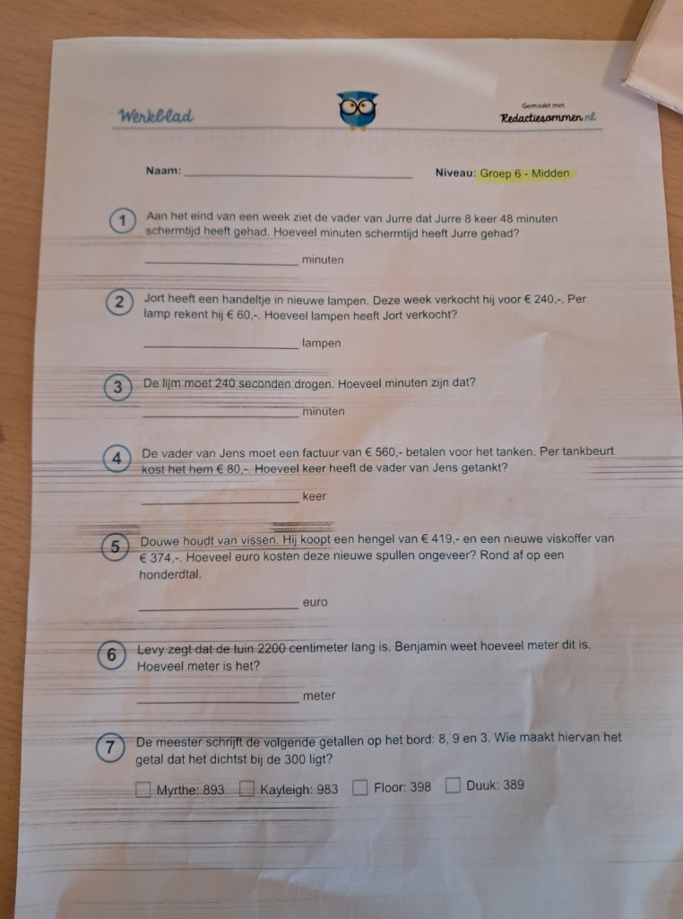 Tot mijn verbazing blijken enkele sommen te makkelijk, ook bij de tweede groep van iets minder goede rekenaars. Met name de deelsommen met grote tientallen (bijv. 560 :7) blijken eenvoudig voor deze kinderen. Schatten, afgerond op een honderdtal, hoeveel twee bedragen (613 en 265) bij elkaar opgeteld zijn is moeilijker. Ik leg uit: zoek het honderdtal wat het dichtst ligt bij de grove (ongeveer) uitkomst. Ik stuur twee keer een kind terug naar de klas als deze niet wil werken.