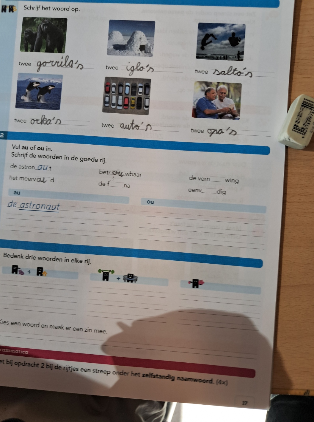 Bij de spelling les komen eerst een reeks ei- en ij-woorden ter sprake: hoe zat het ook alweer: welke woorden staan in de ei-lijst. Dan volgt een oefendictee met de woorden: de citruspers, het beeld, de iglo’s, het gerechtje, het bedrijf. De zin: Mees en Jip trokken met hun tentje door Nederland. sluit het dictee af. Na het gezamenlijk nakijken met een blauw potlood, krijgt de klas 10 minuten om de opdracht te maken op blz. 17 van het taalwerkschrift.