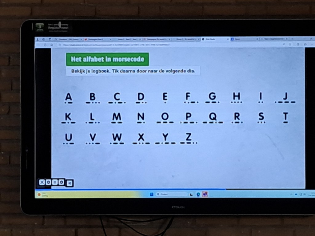 Het is tijd voor de lunch; twee kinderen halen beneden het fruit en de overige pakken hun trommeltje en fles met eten en drinken. Onder het eten kunnen twee kinderen het scherm met het morse alfabet niet laten voor wat het is en blijven bezig woorden in morse te vormen. Tijdens de lunch praat ik even met meester Klaas over de ontwikkeling van enkele kinderen in de klas.
