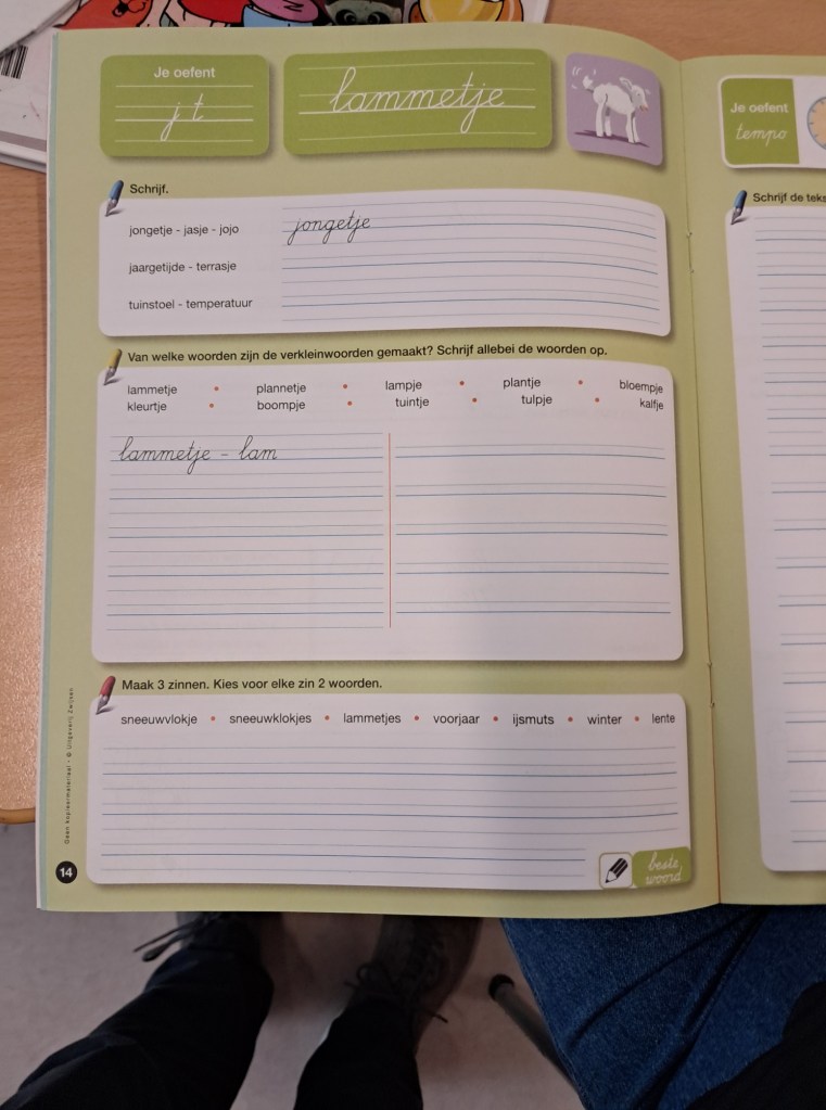 Rondlopend geef ik her en der aanwijzingen – schrijf wat kleiner, slijp je potlood, schrijf wat langzamer, dan gaat het beter e.a.- en zie dat sommige kinderen het verzinnen van een eigen volzin met gegeven woorden heel moeilijk vinden. Het schrijven gebeurt overigens over het algemeen met overgave, ook een kind dat meestal bij opdrachten vooral snel werkt, neemt nu wat meer tijd.